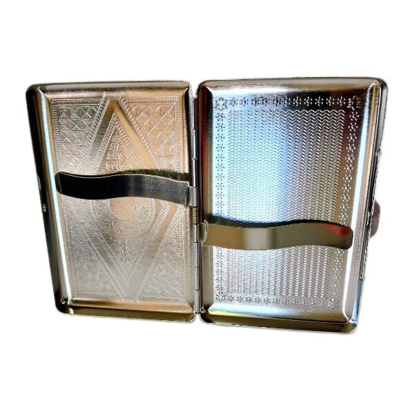 A sturdy metal tin for your taylor-made or pre-rolled cigarettes. It has spring loaded clips on the inside to hold your cigarettes in place, and can hold a total of 14 taylor-mades. Dimensions are 70mm x 112mm when closed and 140mm x 112mm when open. Designs differ between shipments and may differ to that shown.